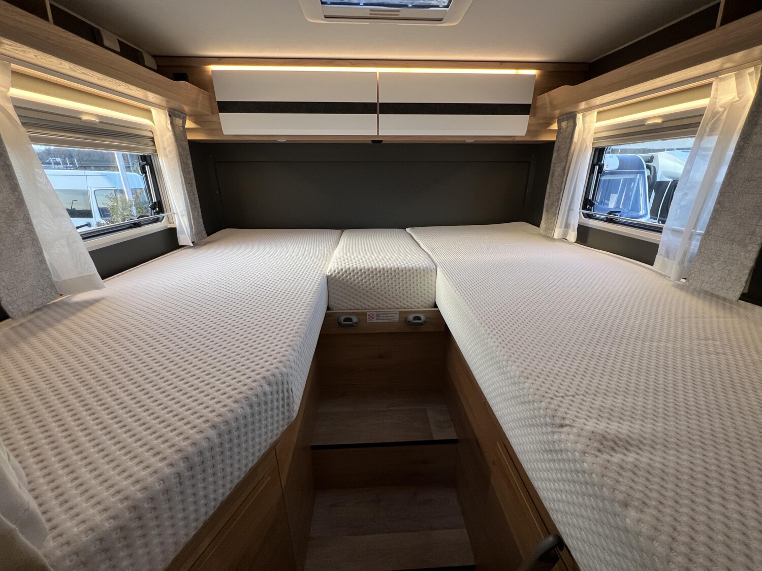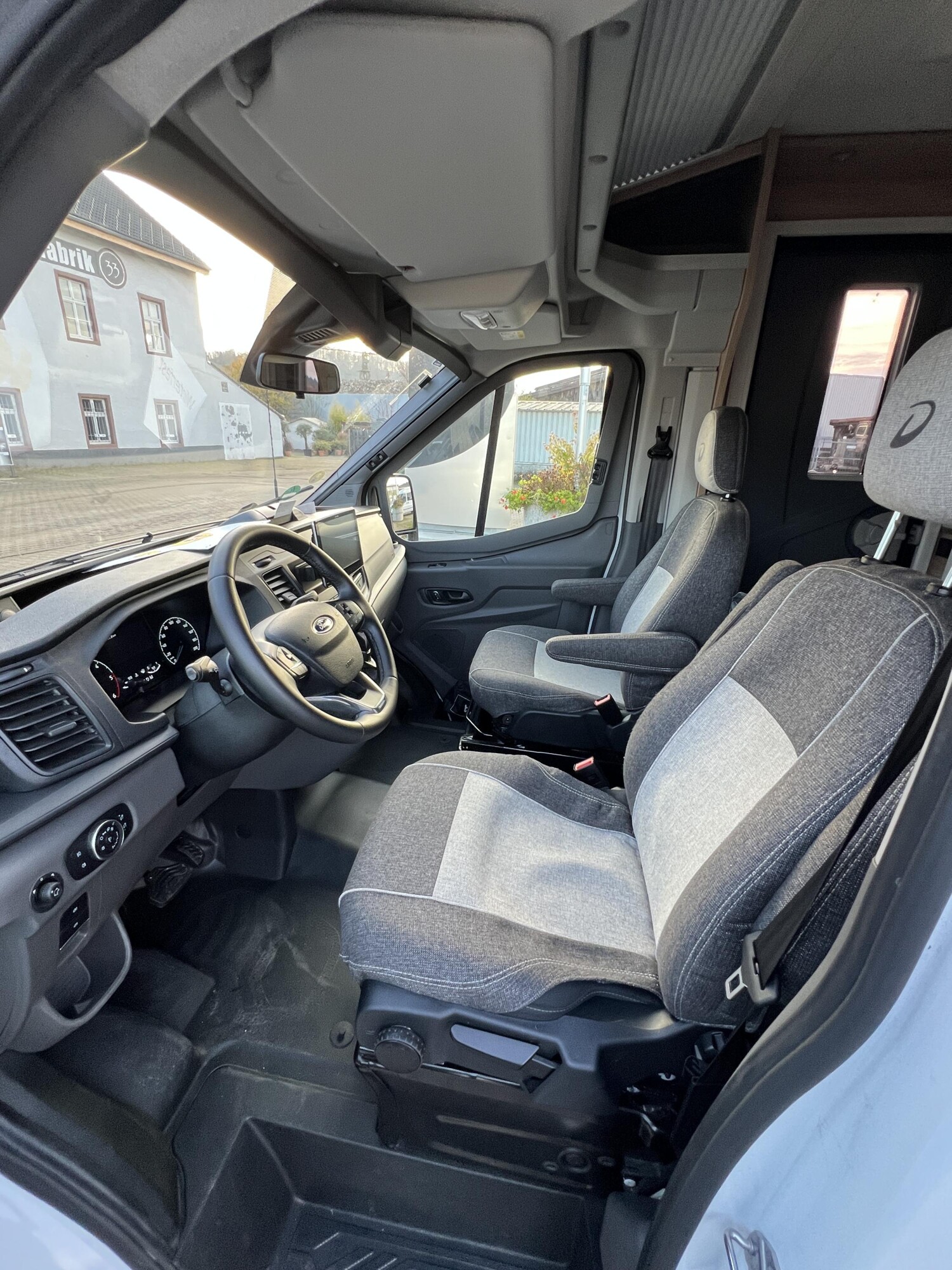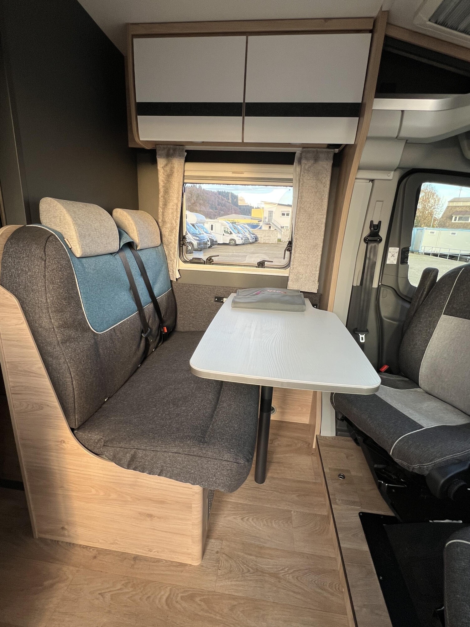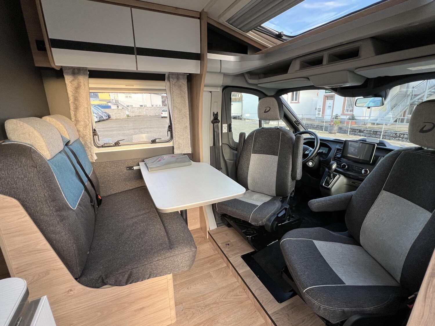 - Comfort Paket T 45 (Klimaanlage inkl. Staub- und Pollenfilter, Handschuhfach mit Deckel, abschließbar, Innenraumpaket Trend-Line, Seitenschutzleisten in Wagenfarbe lackiert, Stoßfänger vorn in Wagenfarbe lackiert, Nebelscheinwerfer, Scheinwerfer mit statischem Abbiegelicht, Außenspiegel elektrisch einstellbar und beheizbar, Alufelge Ford 16 Zoll, schwarz, Frontscheibe, beheizbar, Scheibenwischer mit Regensensor, Notbrems-Assistent, aktiv (kamerabasiert), Fahrspur-Assistent mit Müdigkeitswarner, Fernlicht-Assistent und Fahrspurhalte-Assistent, Scheinwerfer-Assistent mit Tag/Nacht-Sensor, Wohnraumtür mit Fenster inkl. Verdunkelung und Zentralverriegelung (inkl. Fahrerhaustüre), Ausstellfenster in der T-Haube, Verdunklungsjalousien im Fahrerhaus, Panorama-Dachhaube 70 x 50 cm im Wohnraum, Wohnwelt Salerno inkl. Fahrer- und Beifahrer-Sitzbezug, Light Moments: Indirekte Wandflächen-Ambientebeleuchtung, Light Moments: Indirekte Ambientebeleuchtung über den Dachstauschränken, Stauraum-Türe links, Bettumbau Einzelbetten zu Doppelbett)