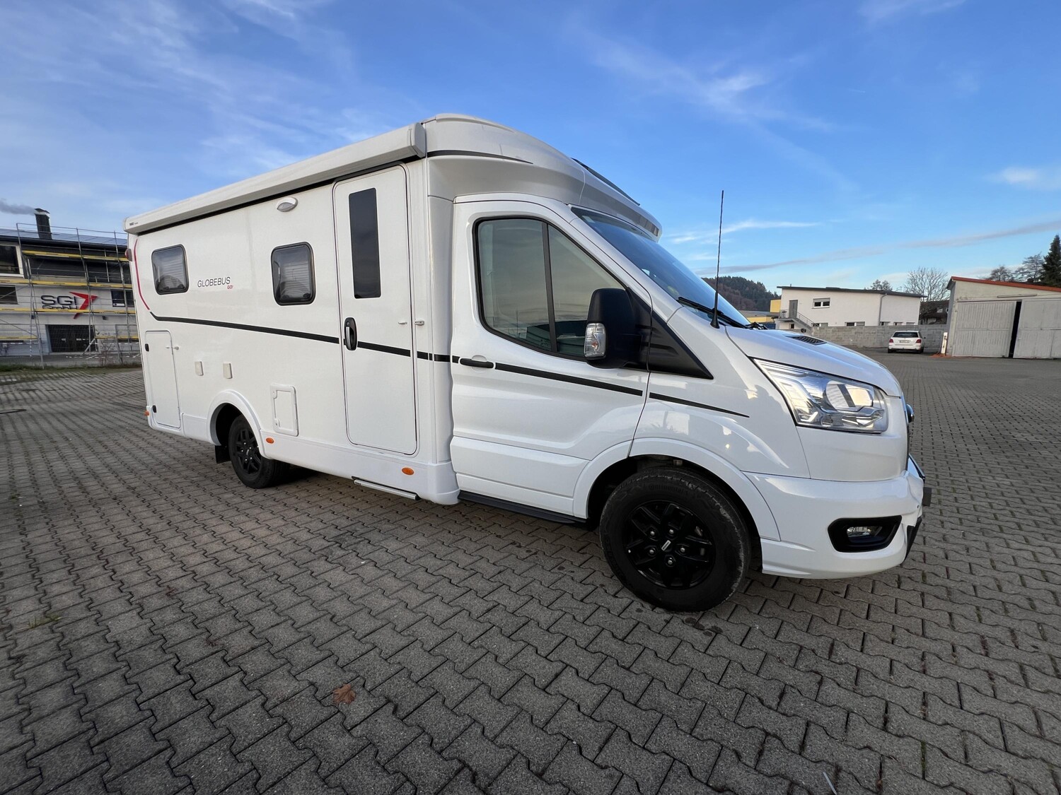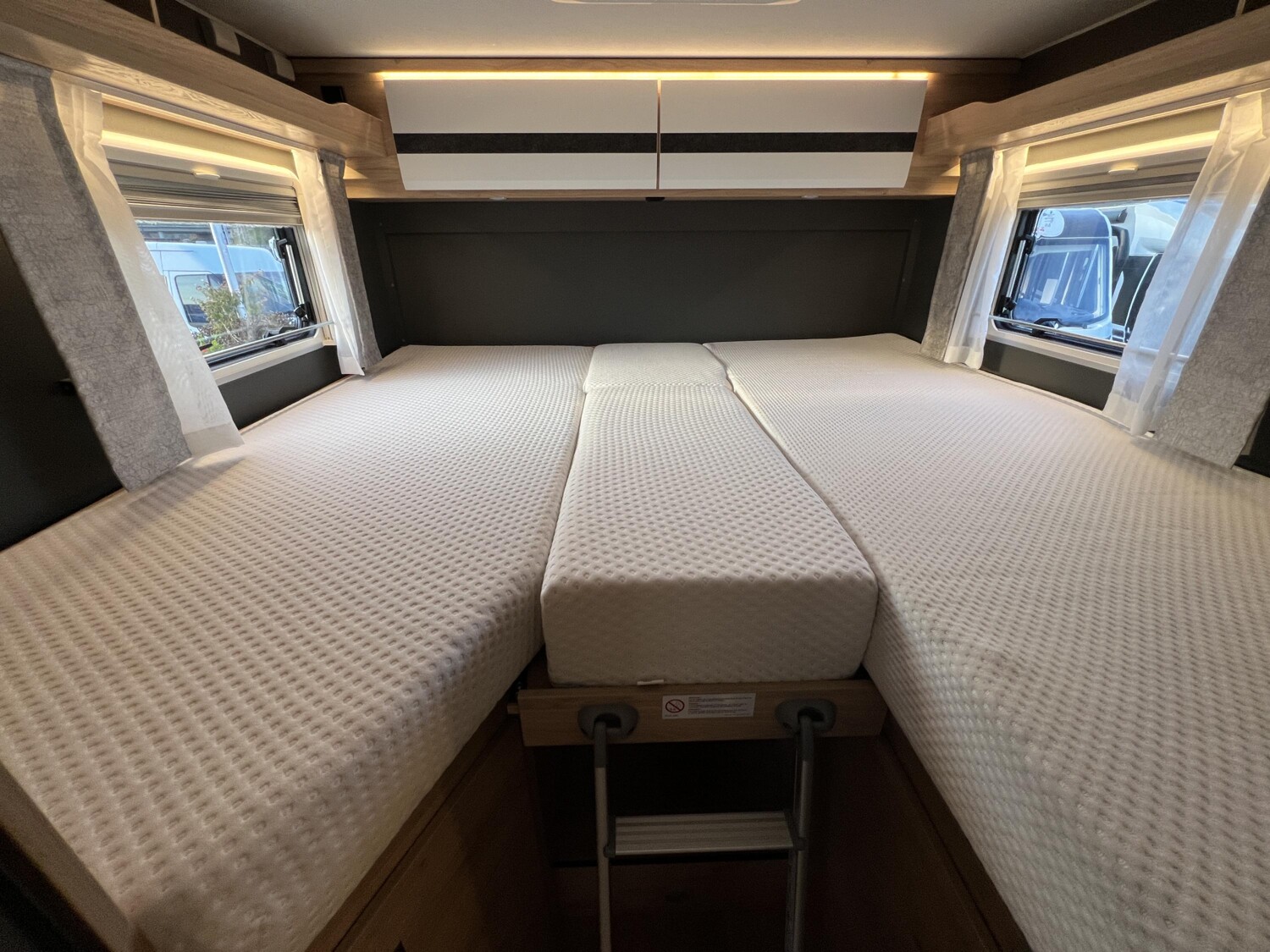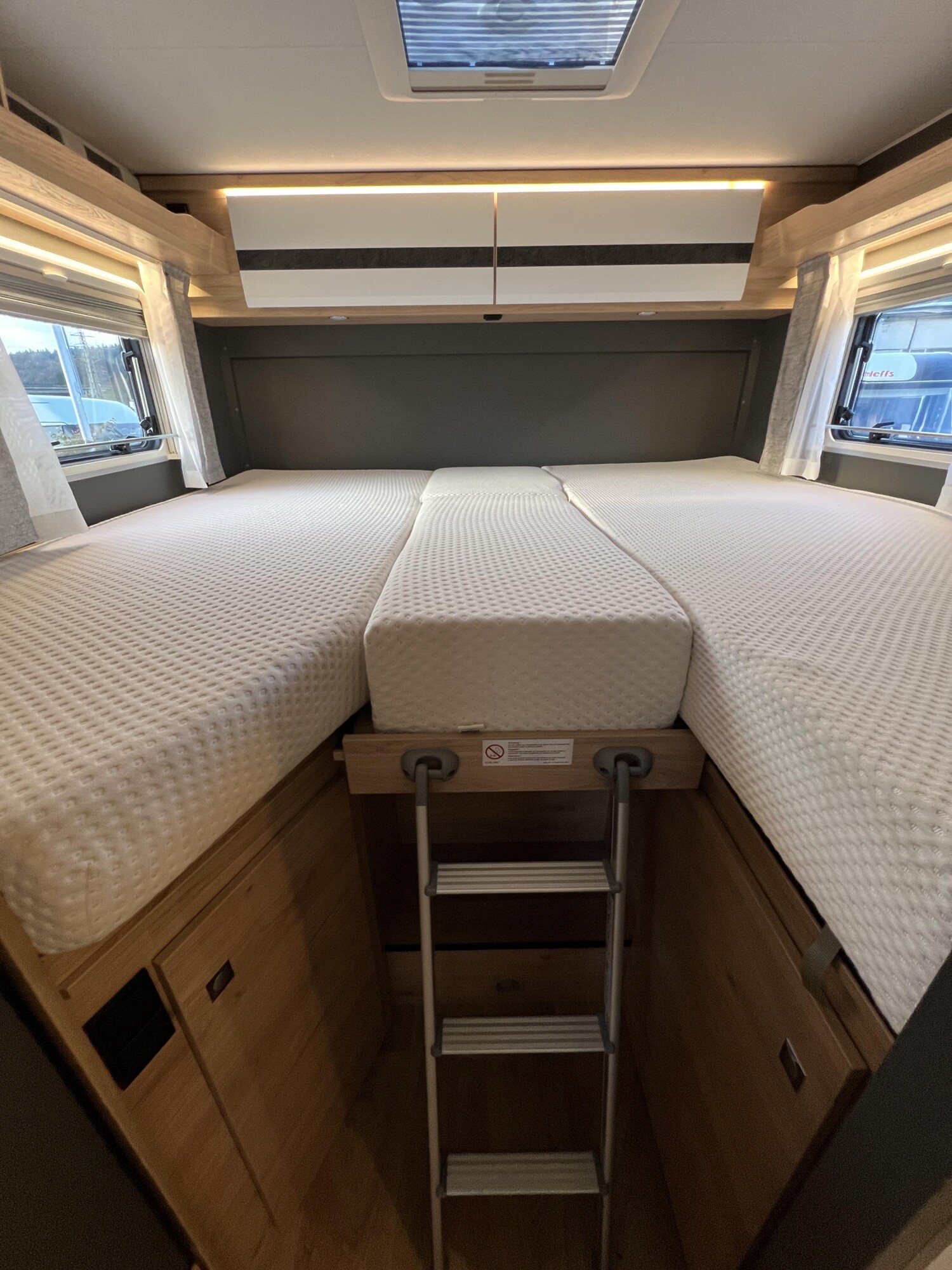 - Comfort Paket T 45 (Klimaanlage inkl. Staub- und Pollenfilter, Handschuhfach mit Deckel, abschließbar, Innenraumpaket Trend-Line, Seitenschutzleisten in Wagenfarbe lackiert, Stoßfänger vorn in Wagenfarbe lackiert, Nebelscheinwerfer, Scheinwerfer mit statischem Abbiegelicht, Außenspiegel elektrisch einstellbar und beheizbar, Alufelge Ford 16 Zoll, schwarz, Frontscheibe, beheizbar, Scheibenwischer mit Regensensor, Notbrems-Assistent, aktiv (kamerabasiert), Fahrspur-Assistent mit Müdigkeitswarner, Fernlicht-Assistent und Fahrspurhalte-Assistent, Scheinwerfer-Assistent mit Tag/Nacht-Sensor, Wohnraumtür mit Fenster inkl. Verdunkelung und Zentralverriegelung (inkl. Fahrerhaustüre), Ausstellfenster in der T-Haube, Verdunklungsjalousien im Fahrerhaus, Panorama-Dachhaube 70 x 50 cm im Wohnraum, Wohnwelt Salerno inkl. Fahrer- und Beifahrer-Sitzbezug, Light Moments: Indirekte Wandflächen-Ambientebeleuchtung, Light Moments: Indirekte Ambientebeleuchtung über den Dachstauschränken, Stauraum-Türe links, Bettumbau Einzelbetten zu Doppelbett)