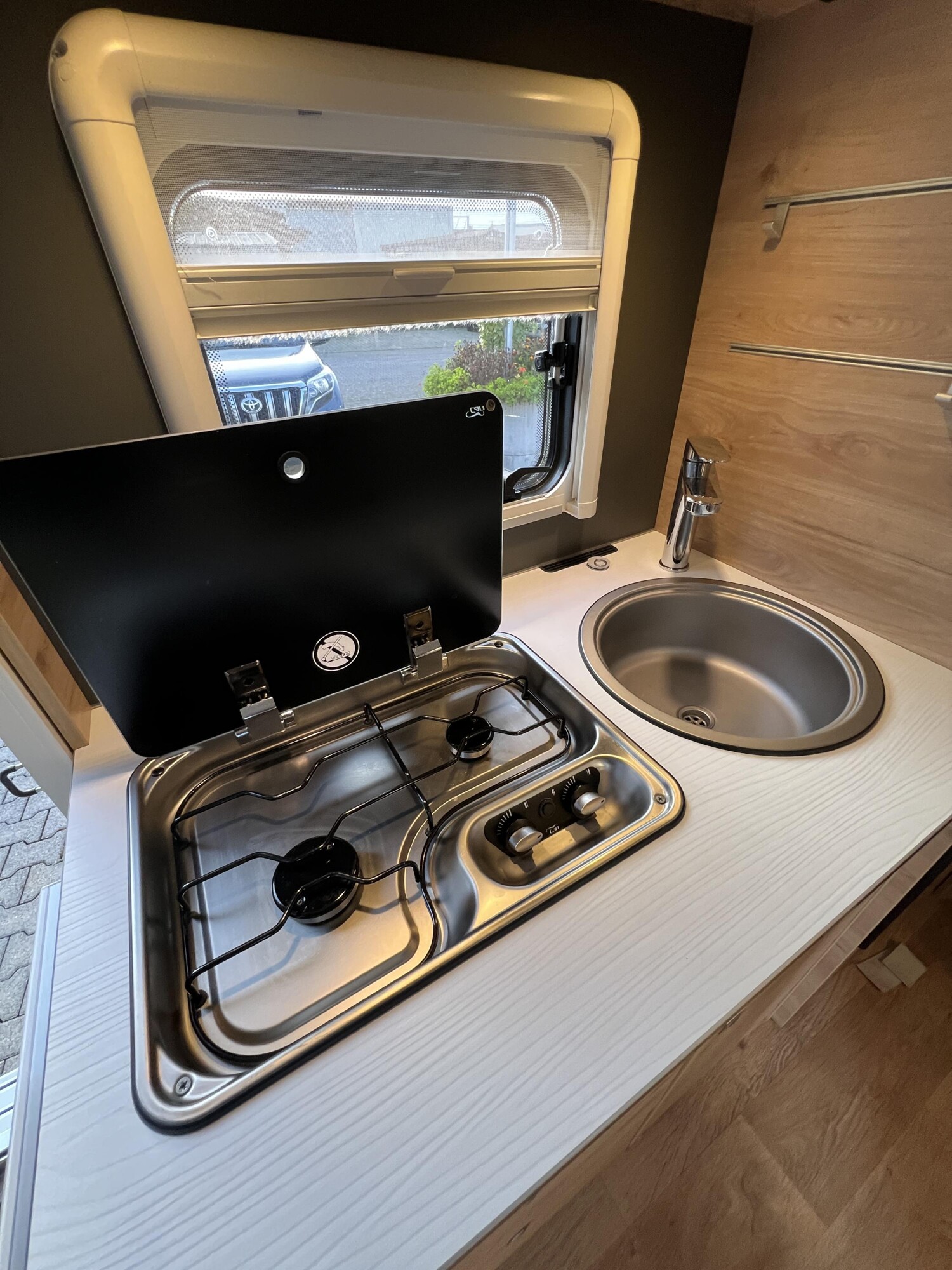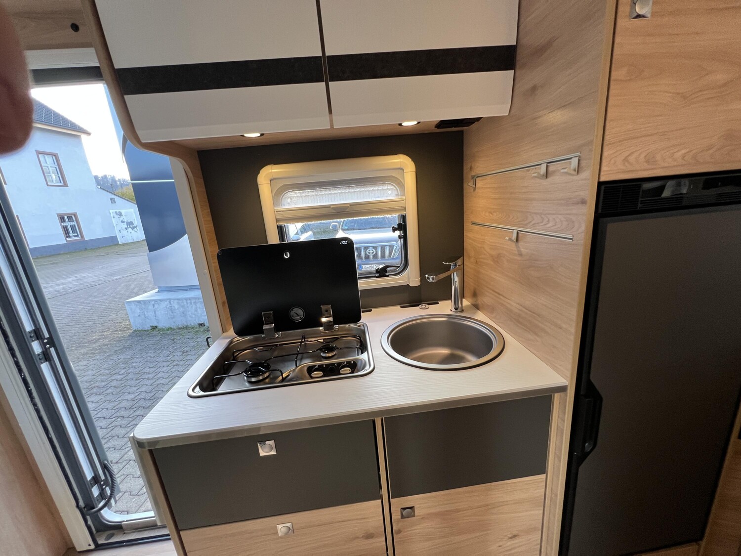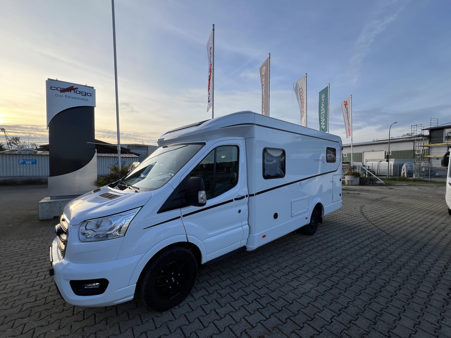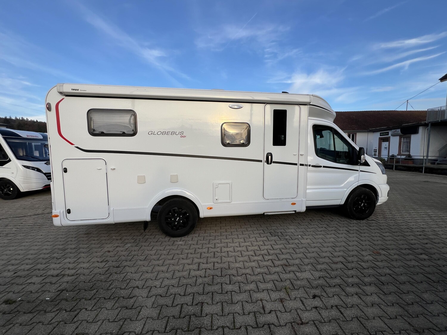 - Comfort Paket T 45 (Klimaanlage inkl. Staub- und Pollenfilter, Handschuhfach mit Deckel, abschließbar, Innenraumpaket Trend-Line, Seitenschutzleisten in Wagenfarbe lackiert, Stoßfänger vorn in Wagenfarbe lackiert, Nebelscheinwerfer, Scheinwerfer mit statischem Abbiegelicht, Außenspiegel elektrisch einstellbar und beheizbar, Alufelge Ford 16 Zoll, schwarz, Frontscheibe, beheizbar, Scheibenwischer mit Regensensor, Notbrems-Assistent, aktiv (kamerabasiert), Fahrspur-Assistent mit Müdigkeitswarner, Fernlicht-Assistent und Fahrspurhalte-Assistent, Scheinwerfer-Assistent mit Tag/Nacht-Sensor, Wohnraumtür mit Fenster inkl. Verdunkelung und Zentralverriegelung (inkl. Fahrerhaustüre), Ausstellfenster in der T-Haube, Verdunklungsjalousien im Fahrerhaus, Panorama-Dachhaube 70 x 50 cm im Wohnraum, Wohnwelt Salerno inkl. Fahrer- und Beifahrer-Sitzbezug, Light Moments: Indirekte Wandflächen-Ambientebeleuchtung, Light Moments: Indirekte Ambientebeleuchtung über den Dachstauschränken, Stauraum-Türe links, Bettumbau Einzelbetten zu Doppelbett)