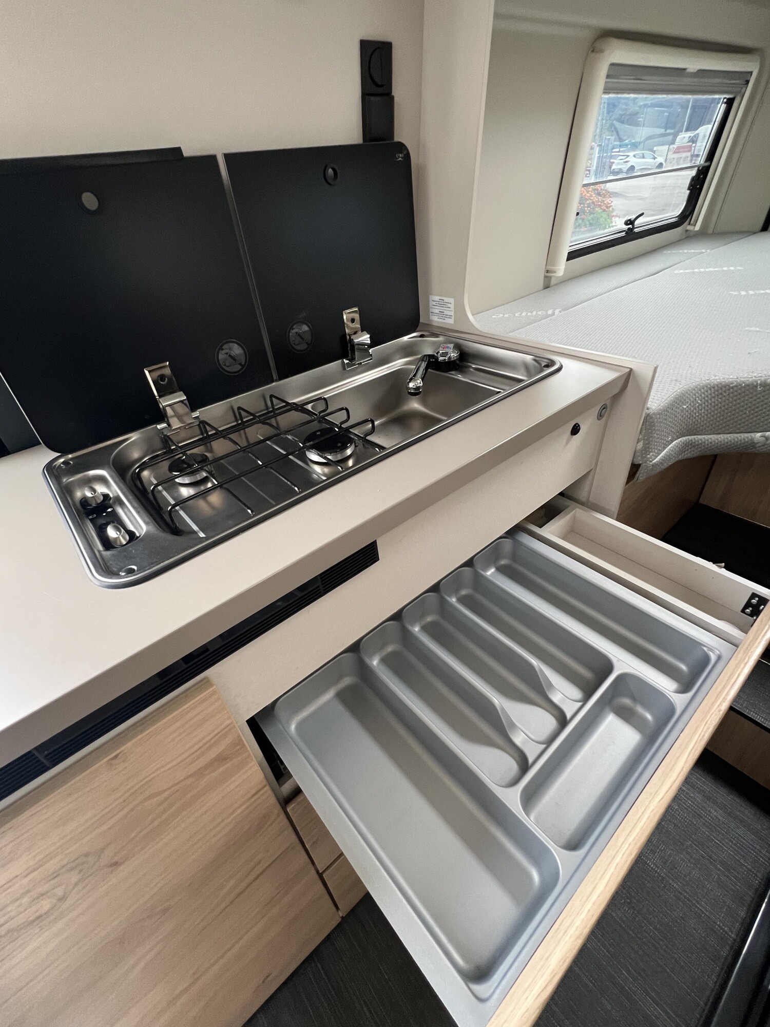 • Fenster mit Fliegenschutz und Verdunklungsrollo im Heck links (640)